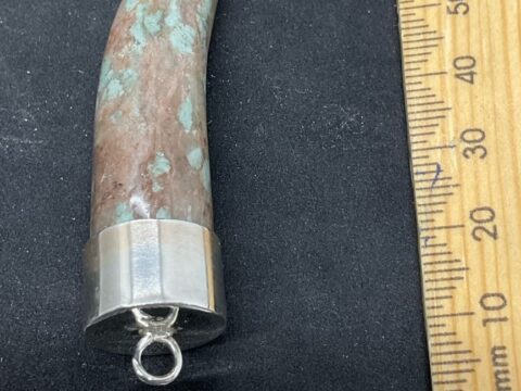 Nundorite Pig Tusk pendant capped in silver. The tusk measures approx 65mm in length including the capping but without the ring. Nundorite is a unique rock found in the district of Broken Hill made up of aegirine and feldspar. Nundorite…