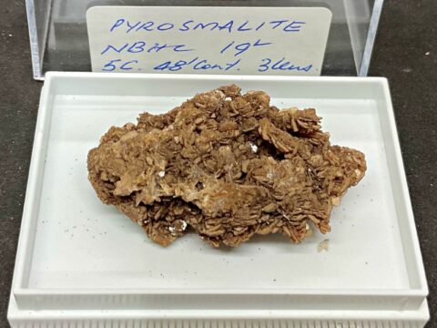 Rare pyrosmalite specimen from the collection of Barry Braes. This specimen comes in the box that is labelled pyrosmalite, NBHC 19th 5C 48’ Cont 3 Lens. Specimen measures approximately 40x25mm. Price $45.00. See Mindat for more on Broken Hill minerals….