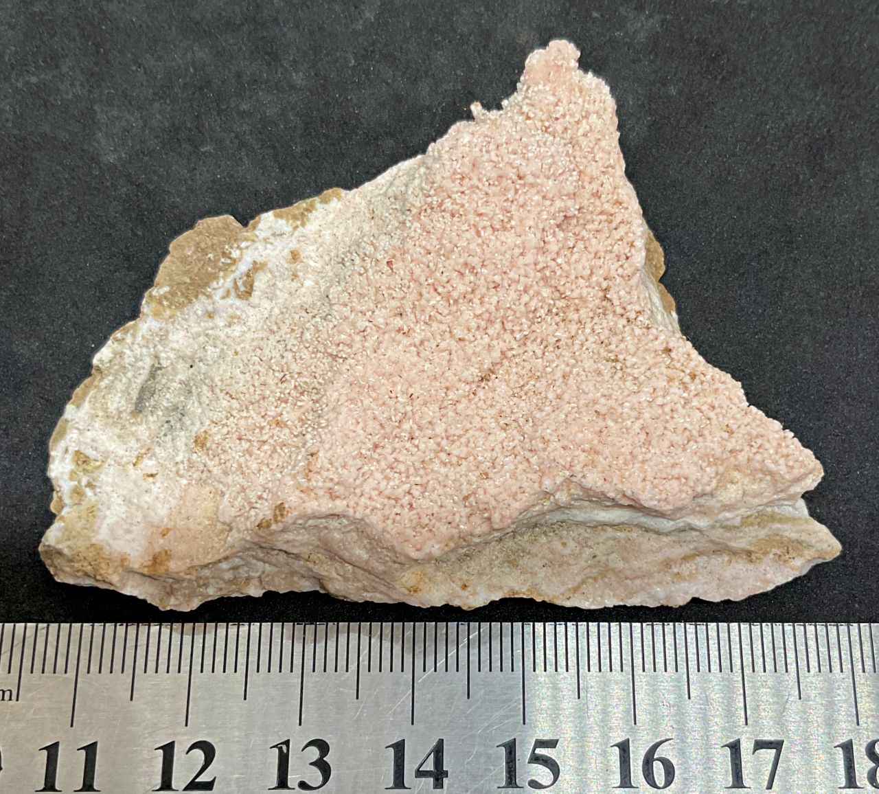 Rhodochrosite in a mass of crystals with a beautiful light pink colour. Specimen measures approx 70x40mm. Price $40.00. See Mindat for more on Broken Hill minerals. Remember to check out our other items for sale.
