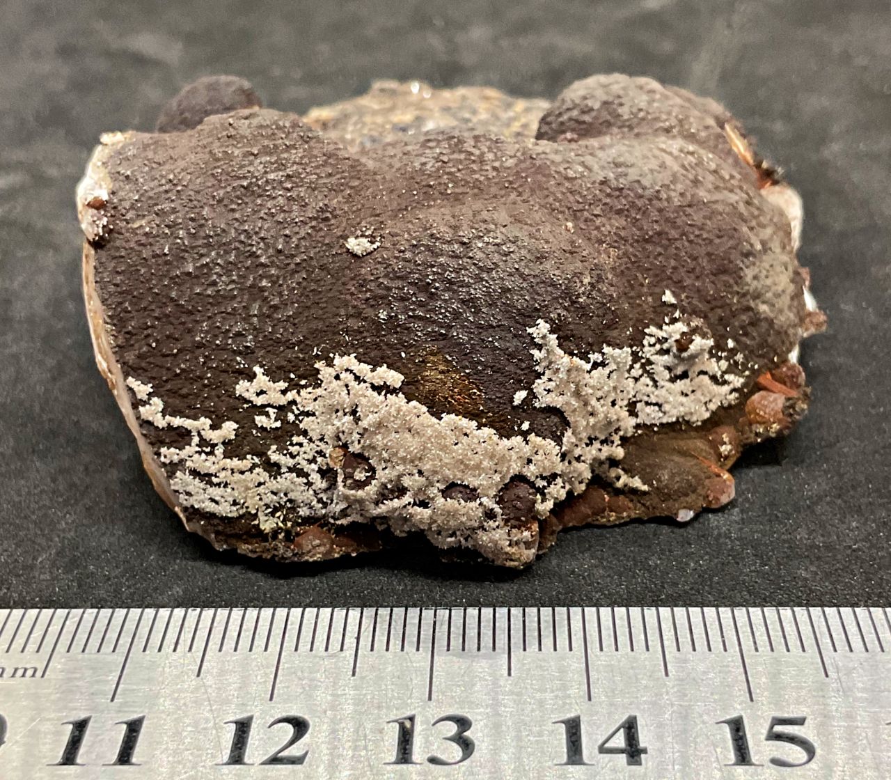 An uncommon specimen of dark sturtite covering botryoidal manganoan calcite with a light covering of micro calcite crystals. Specimen measures approx 75x55mm. Price $55.00. See Mindat for more on Broken Hill minerals. Remember to check out our other items for…