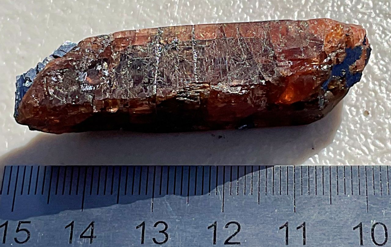 From Broken Hill, a single bustamite crystal with traces of galena attached. Specimen measures approximately 50x11mm. Price $50.00. See Mindat for more on Broken Hill minerals. Remember to check out our other items for sale.